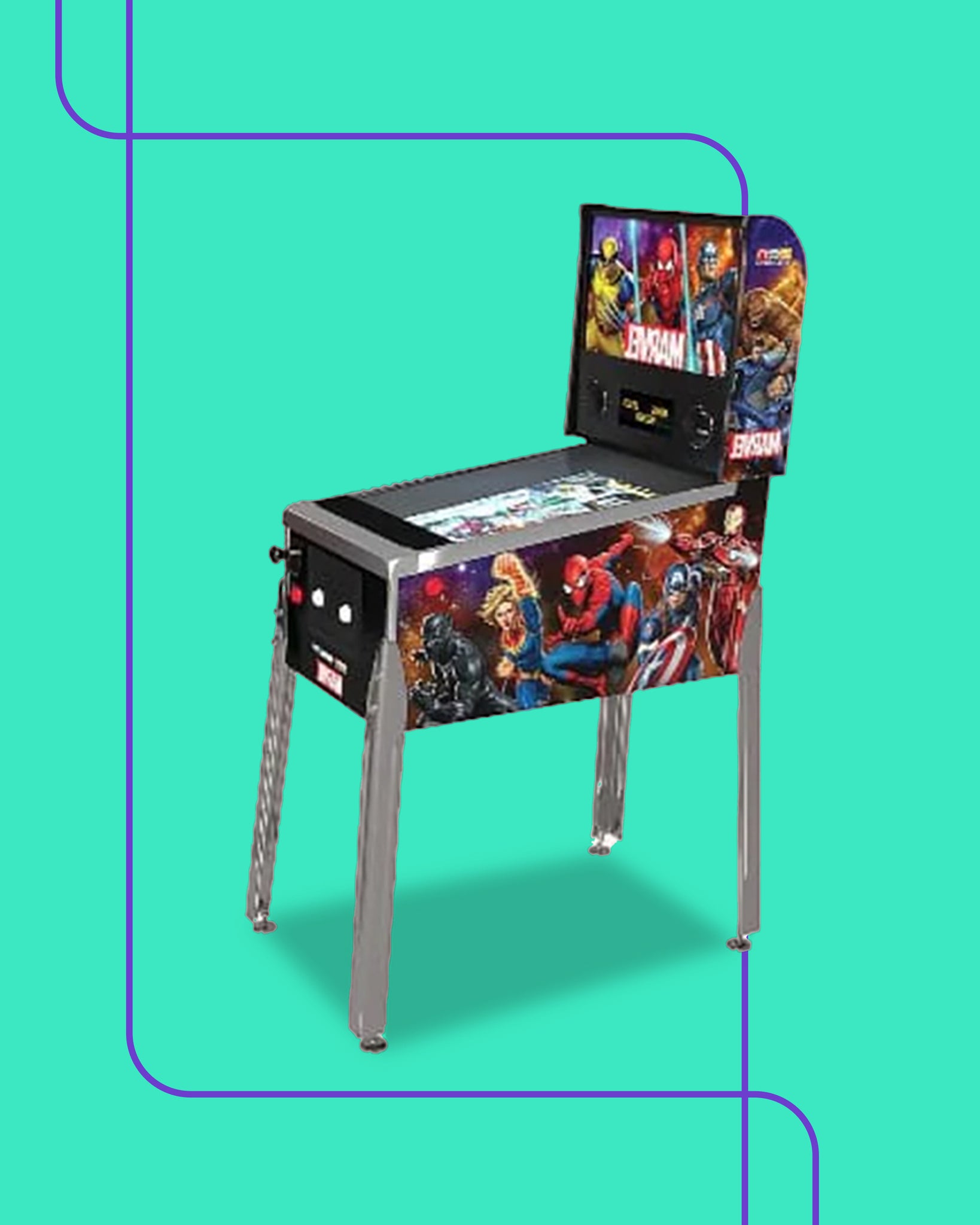 ٧: لعبة مارفل بين بول: رقمية مع لوحة إضاءة. الأبعاد: الارتفاع: ١٫٥٣ سم/العرض: ٩٤ سم/الطول: ٥٣ سم